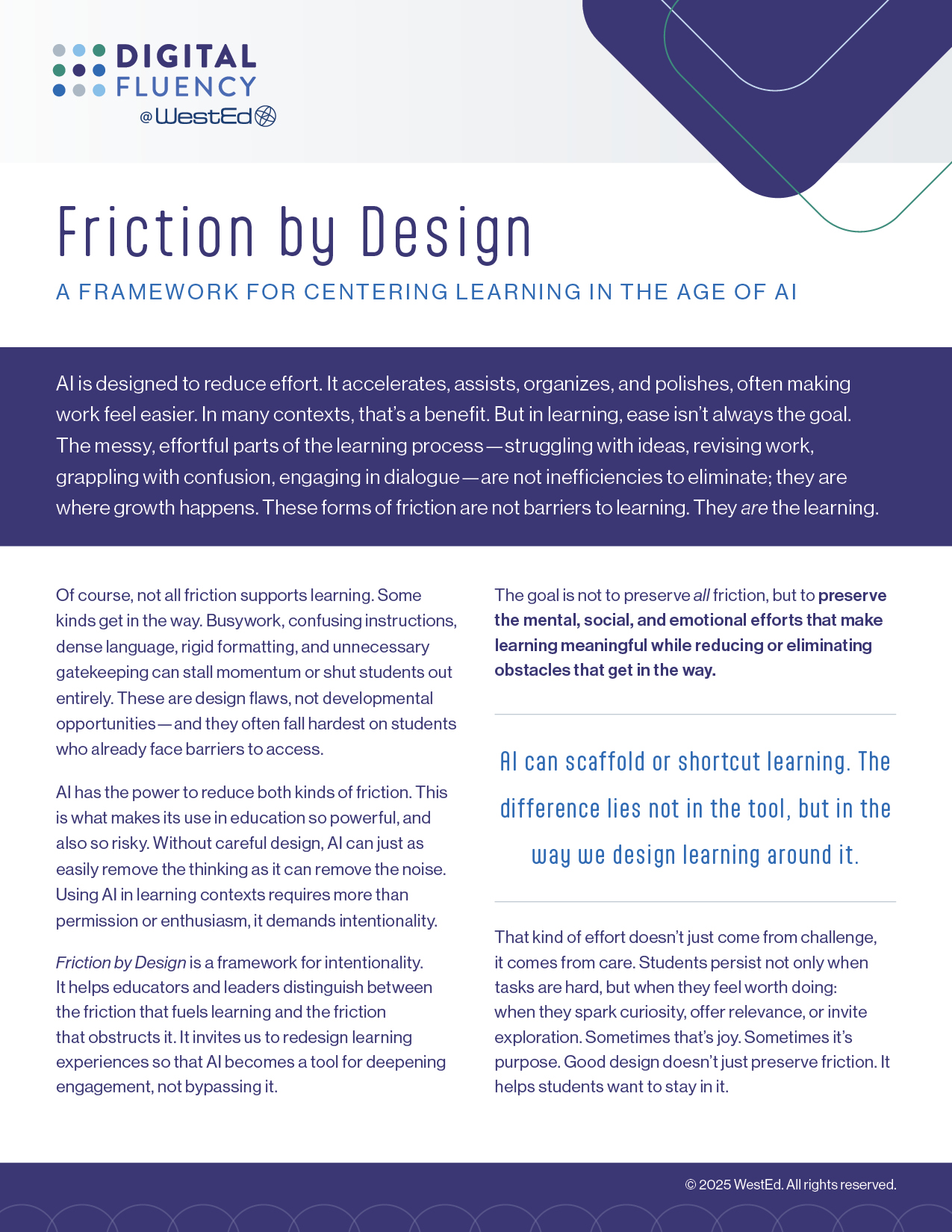 Building a library of practice-focused and practical resources Stay engaged and informed with our growing collection of resources and tools designed to support high-quality learning and meaningful connection. Friction by Design: A Framework for Centering Learning in the Age of AI Leading With AI in K–12 Education: Quick Start Guide Friction by Design: Writing in a Community of Writers with AI